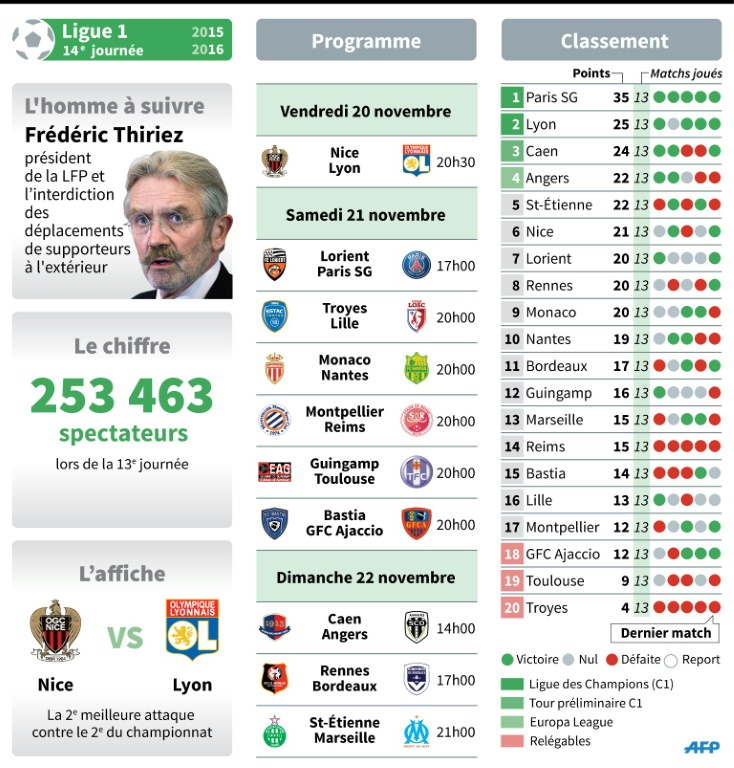 La 14e journée de Ligue 1 s'ouvre vendredi dans un climat appesanti par des mesures de sécurité exceptionnelles, une semaine après les attentats sanglants qui ont frappé Paris et le Stade de France, avec un séduisant Nice-Lyon pour tenter de retrouver le sourire.
