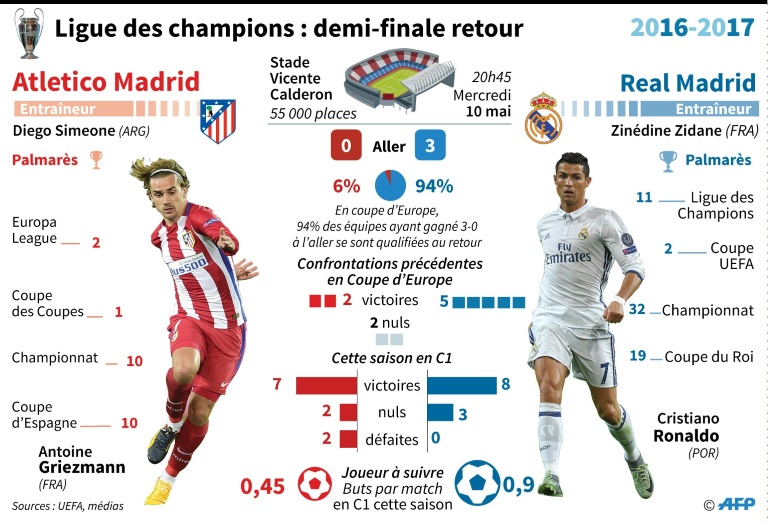 Sur cette pelouse, l'"Atleti" avait balayé en février 2015 le Real Madrid de Carlo Ancelotti (4-0), alors champion d'Europe en titre. Depuis, le Real de Zinédine Zidane a hérité de ce statut, et un tel score mercredi soir serait synonyme d'improbable exploit pour l'équipe de Diego Simeone, qui part quand même de très loin.