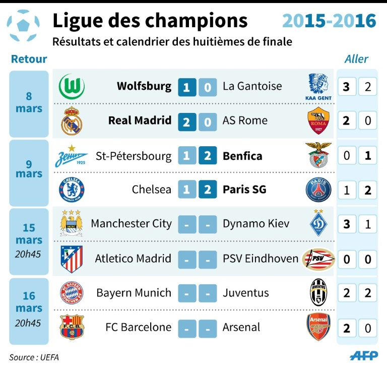 Wolfsburg, nouveau venu à ce stade de la compétition, le Real Madrid coaché par Zinédine Zidane, Benfica et le Paris SG ont déjà obtenu leur ticket pour les quarts.