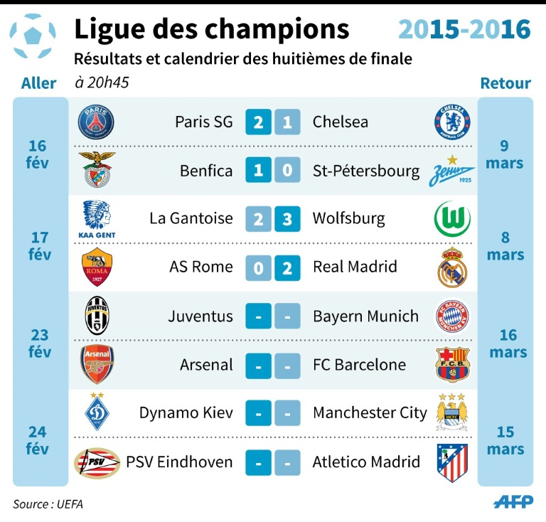 Les 8e de finale allers de la Ligue des champions s'offrent un plateau royal mardi (19h45 GMT, 20h45 heures françaises) avec deux chocs aux allures de finale, Arsenal-FC Barcelone et Juventus Turin-Bayern Munich.