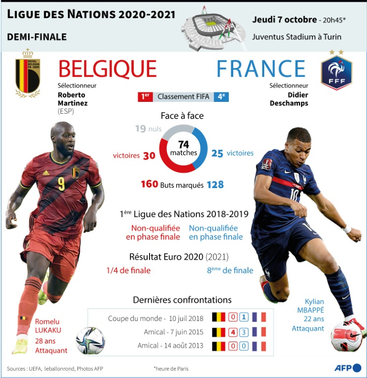 L'heure des retrouvailles ! Tombeurs de la Belgique au Mondial-2018, les Bleus se mesurent Ă leur ancienne victime en demi-finale de Ligue des nations, jeudi (20h45) Ă Turin, un choc au goĂ»t de revanche et surtout de reconquĂȘte pour deux sĂ©lections dĂ©cevantes Ă l'Euro.
