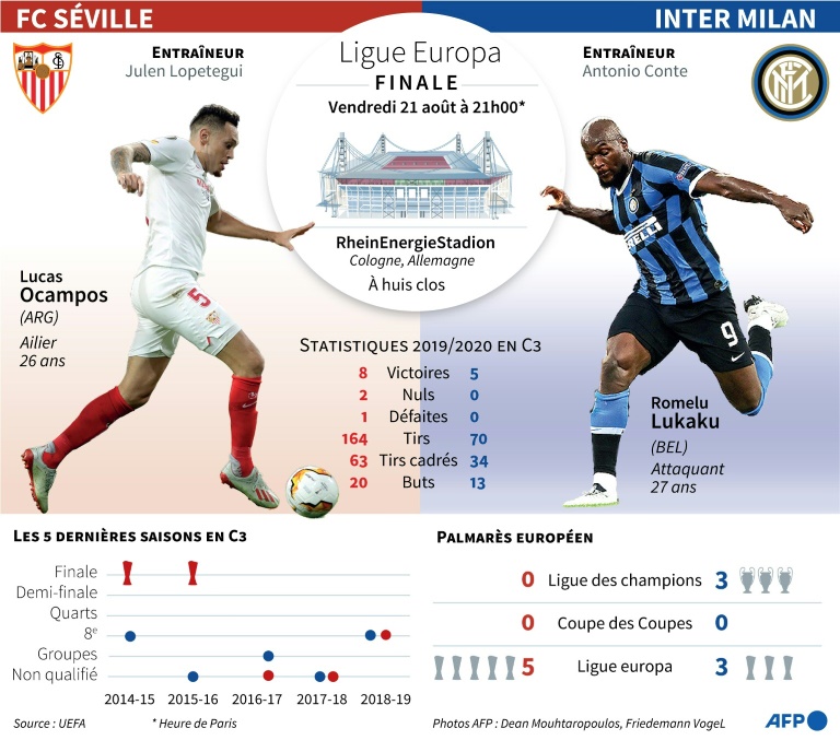 Sixième finale pour Séville, cinquième pour l'Inter Milan: le coronavirus a tout chamboulé, avec huis clos total en Allemagne, mais ce sont finalement des habitués de la Ligue Europa qui se retrouvent en finale vendredi à Cologne.