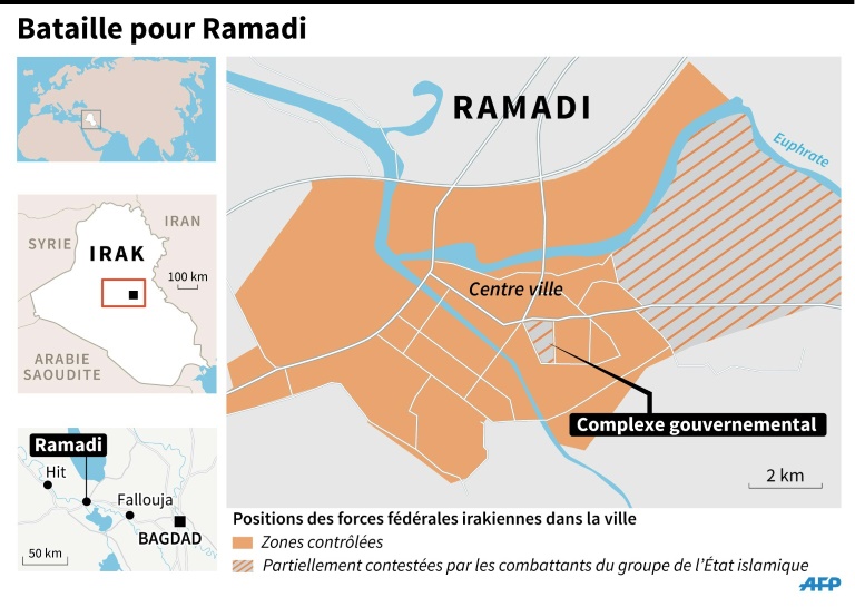 Quasiment tous les civils ont quitté le centre de Ramadi dévasté par les combats. Certains ont été évacués mais d'autres ont été utilisés comme boucliers humains par les jihadistes pour couvrir leur fuite vers l'est de la ville, selon plusieurs témoignages.