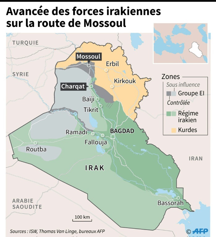 Les forces irakiennes ont encore avancé jeudi avec la prise de Charqat, une ville à 80 km au sud de Mossoul située près des routes de ravitaillement qui devront être utilisées par l'armée lorsqu'elle lancera son offensive contre le bastion de l'EI.