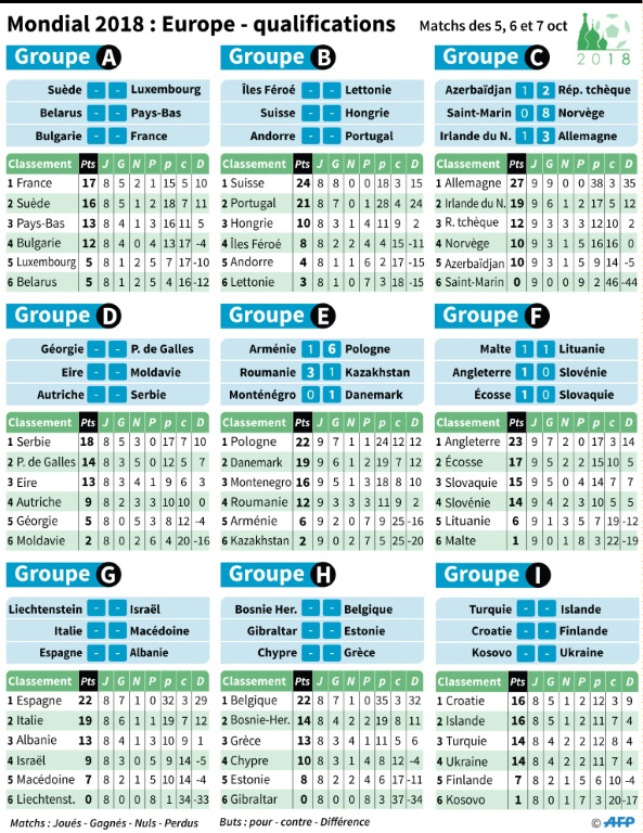 NDLR: Les 9 vainqueurs des groupes qualifiés pour la phase finale en Russie.