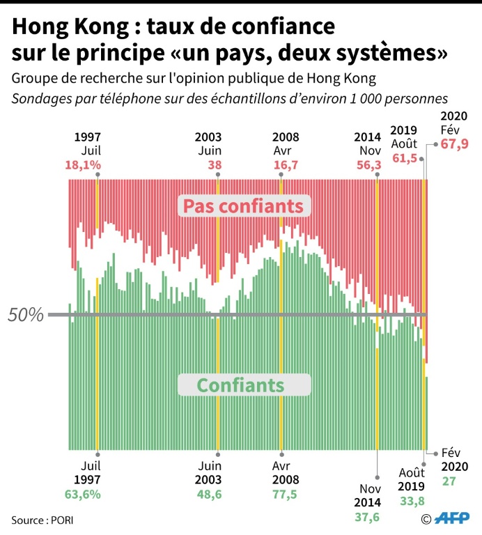 Nombre de Hongkongais voient dans cette loi l'atteinte la plus grave à ce jour au principe "Un pays, deux systèmes" censé garantir à Hong Kong jusque 2047 des libertés inconnues ailleurs en Chine. Une inquiétude partagée par certaines capitales occidentales et par les investisseurs étrangers, comme l'a illustré vendredi le décrochage de la Bourse de Hong Kong, le plus fort en cinq ans.