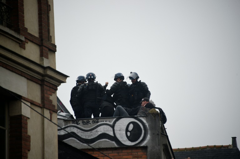 Vers 09H00, les tout derniers manifestants, de très jeunes filles, sont délogés de la bordure du toit après un face-à-face avec les gendarmes mobiles, sous les vivats de leurs camarades en bas dans la rue.