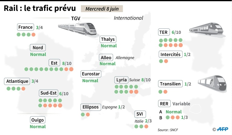 Pour la huitième journée consécutive, le trafic devait rester perturbé mercredi, avec une légère amélioration puisque trois TGV sur quatre circulent, un Transilien sur deux et six Intercités sur dix.