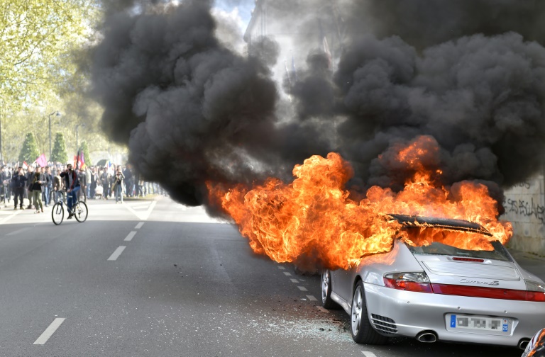 "Tout le monde déteste la police", criaient des manifestants aux visages dissimulés, notamment à Nantes où une Porsche a été incendiée. A Paris, des Autolib ont été saccagées, ainsi que des vitrines et des abribus, a constaté un journaliste de l'AFP.