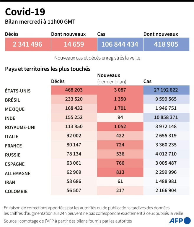 Le laboratoire allemand BioNTech a, par ailleurs, annoncé mercredi le démarrage de la production de son vaccin, conçu avec l'Américain Pfizer, dans une nouvelle usine à Marbourg (Allemagne), destinée à augmenter les livraisons.