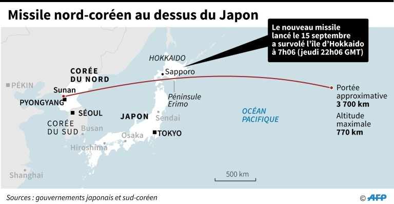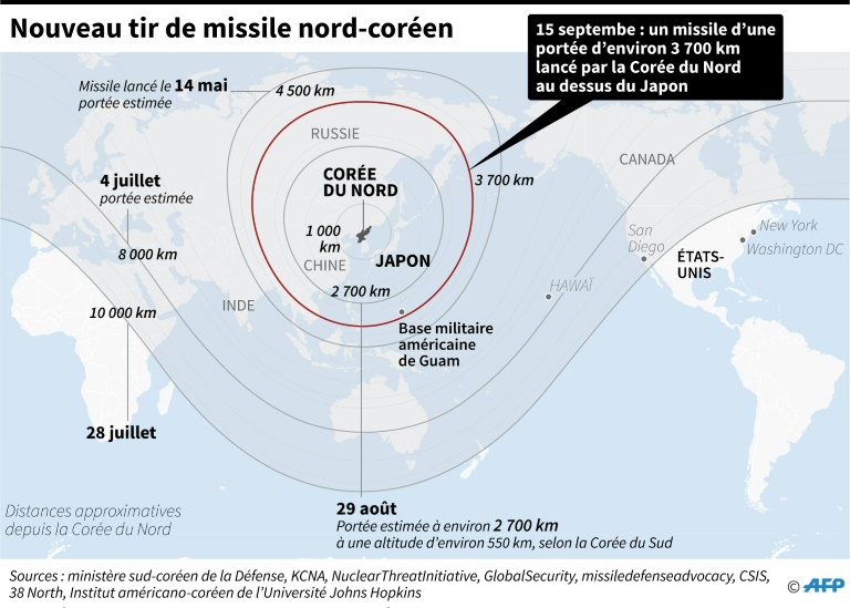 Le missile balistique nord-coréen qui a survolé vendredi ce pays était capable d'atteindre l'île américaine de Guam dans le Pacifique, selon des experts. Il a parcouru une distance inédite après avoir été tiré d'un site proche de Pyongyang, quatre jours après l'adoption par l'ONU d'une huitième série de sanctions pour tenter de pousser le pays reclus à négocier ses programmes balistique et nucléaire interdits.