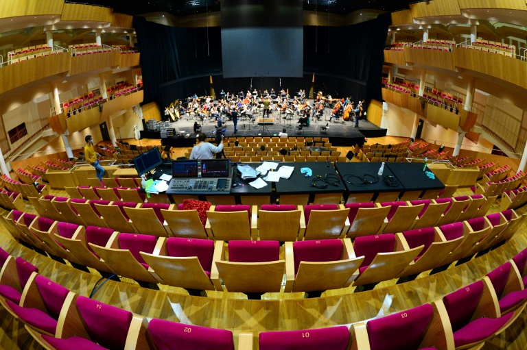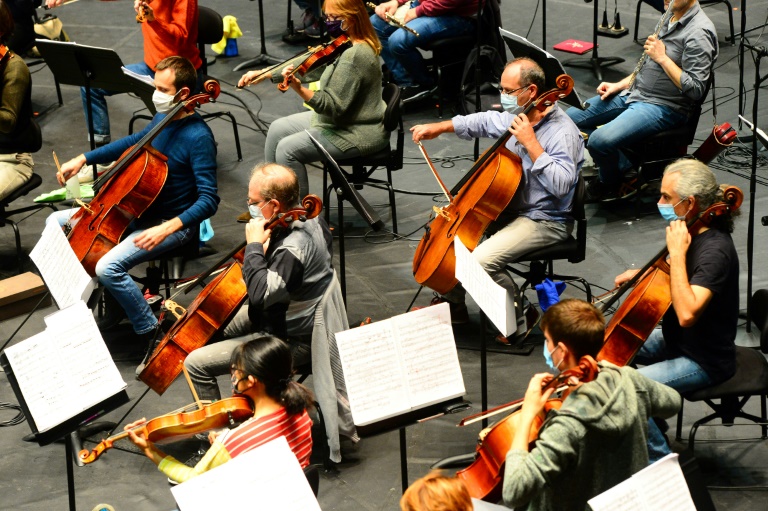 Sur scène, précautions sanitaires obligent, chaque musicien dispose d'un spray désinfectant et d'un chiffon. Les joueurs d'instruments à vent -sans masque- sont distanciés au maximum mais les cordes doivent faire avec. Les chanteurs, tous testés au Covid-19, gardent leurs distances. Le chef Pierre Dumoussaud dirige, masqué, sa soixantaine de musiciens, seulement interrompu ça et là par la voix du responsable de la captation sonore, effectuée par le label Alpha Classics, avec des dizaines de longs micros installés un peu partout, face à la grande salle vide.