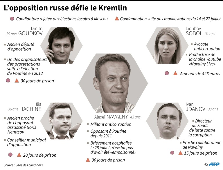 La plupart de ses alliés et des autres meneurs de la contestation ont eux aussi écopé de courtes peines de détention, à commencer par plusieurs candidats de l'opposition refoulés des élections locales de septembre tels qu'Ilia Iachine, Ivan Jdanov et Dmitri Goudkov. Lioubov Sobol, avocate de 31 ans, est pour sa part en grève de la faim depuis presque trois semaines pour protester contre son éviction du scrutin. "La Commission électorale ne fait pas son travail, les tribunaux ne font pas leur travail. La seule chose qui fonctionne, c'est la rue", a déclaré sur Twitter la jeune femme, qui a échappé à la prison du fait qu'elle a un enfant en bas âge.