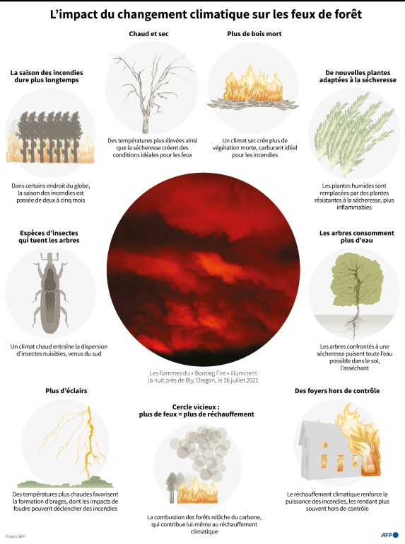 Pour la neuvième journée d'affilée, quelque 2.100 soldats du feu se sont aussi relayés dans l'Oregon pour tenter de contenir le Bootleg Fire, brasier déjà plus grand que la ville de New York. Ces pompiers travaillent "nuit et jour" a assuré Joe Hessel, en charge de la gestion des feux de la zone. "Ce feu est un véritable fléau, et nous nous préparons à un combat intense" ces prochains jours, a-t-il annoncé.