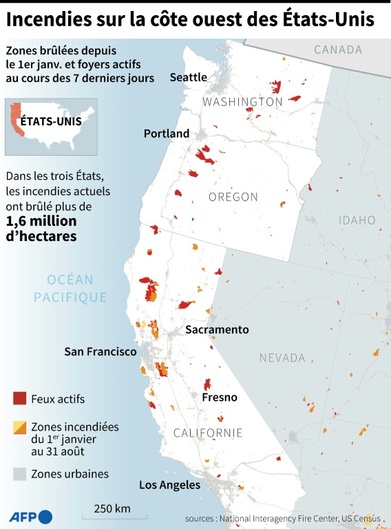Alimentés depuis des jours par une sécheresse chronique et des vents violents, des dizaines de feux disséminés de la frontière du Canada à celle du Mexique, dans les Etats de Washington, d'Oregon et de Californie, ravageaient la côte ouest américaine.