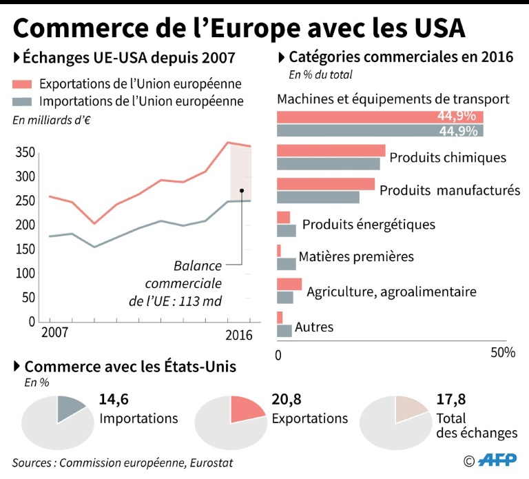 Les Européens exportent environ pour 5 milliards d'euros d'acier et pour 1 milliard d'euros d?aluminium chaque année vers les Etats-Unis. Les mesures américaines, jugées protectionnistes par l'UE, pourraient leur porter préjudice à hauteur de 2,8 milliards d'euros, selon les calculs de la Commission.