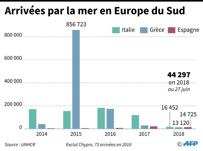 Il sera aussi marqué par la fragilité inédite de la chancelière allemande, dont l'autorité est défiée sur la question migratoire: son ministre de l'Intérieur menace de refouler aux frontières les migrants déjà enregistrés ailleurs, de manière unilatérale, faute de mesures européennes contre les déplacements de migrants dans l'UE. "Le débat sur les migrations s'enflamme de plus en plus, a souligné mercredi le président du Conseil européen, Donald Tusk, craignant que l'absence de solution européenne fournisse "un nombre croissant d'arguments" à des mouvements populistes "avec une tendance à l'autoritarisme manifeste".