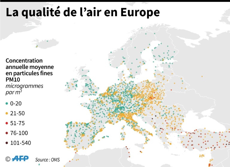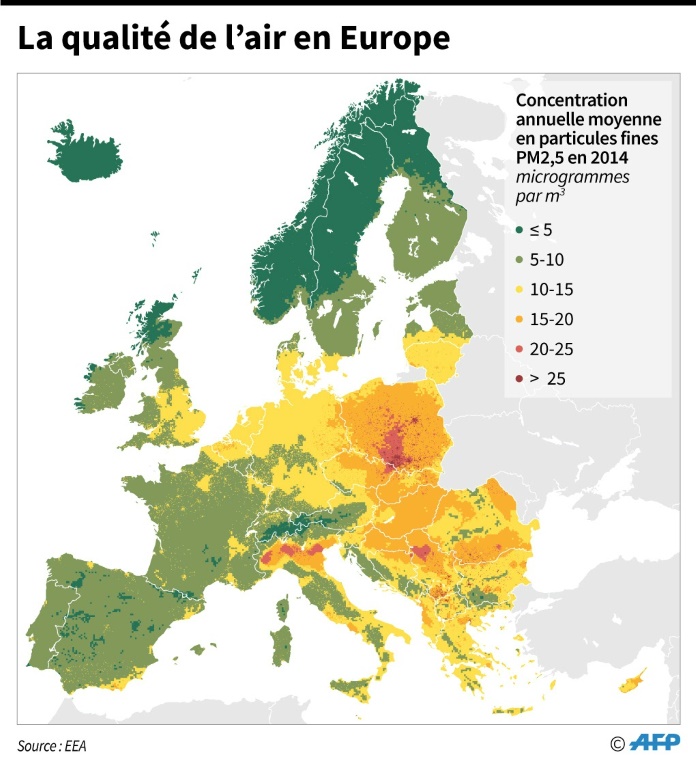 Selon l'AEE, entre 16% et 20% de la population des villes européennes ont été exposés à des niveaux nocifs de concentrations de particules fines (PM10) entre 2013 et 2015. Mais la proportion monte jusqu'entre 50% et 62% si on applique les directives de l'OMS.