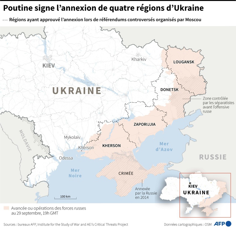 Après la signature des traités d’annexion vendredi en grande pompe au Kremlin par le M. Poutine et les dirigeants des régions séparatistes et occupées, la Cour constitutionnelle russe les a jugé dimanche “conformes à la Constitution”.