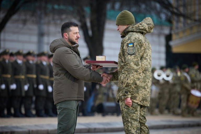 Le président Zelensky a aussi rendu hommage aux soldats ukrainiens sur le front et ceux tombés au combat. "Nous sommes tous fiers de vous !", a-t-il lancé sous un ciel gris lors d'une cérémonie de remise de décorations organisée dans la matinée au pied de la cathédrale Sainte-Sophie de Kiev.