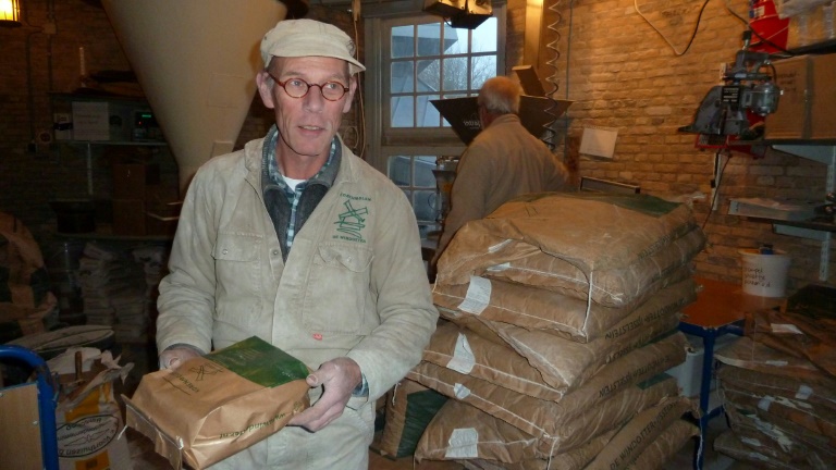 De retour de sa livraison matinale hebdomadaire aux boulangers du coin, Maarten Dolman lance la production du jour: jusqu'à une tonne de farine. Les majestueuses ailes de 26 mètres de diamètre font leur travail.