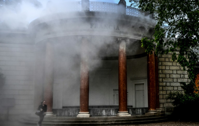 Pour y parvenir, il faut d'abord franchir une petite porte latérale du pavillon français, dont la façade est intacte depuis sa création en 1912. Née à Lille mais formée en Grande-Bretagne, l'artiste française propose une oeuvre multi-disciplinaire pleine d'imagination sous le titre énigmatique "Vois ce bleu profond te fondre".