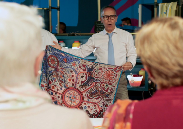 Equipé d'un micro, il commente au public les différentes étapes de l'impression du fameux carré en soie, que réalise méticuleusement sous les yeux des visiteurs Frédéric Libaud, imprimeur sur étoffe venu de Lyon, travaillant depuis 27 ans chez Hermès.