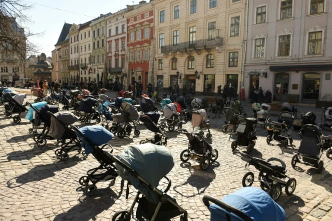 Disposés en rang, 109 landaus et paniers de bébés sont alignés sur la place du marché de Lviv, une tentative pour les habitants de cette ville de l'Ouest de l'Ukraine de faire leur deuil, trois semaines après le début du conflit contre la Russie.