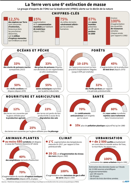 Leur rapport constate qu'un million d'espèces animales et végétales sont menacées d'extinction, à moins de changements majeurs de société. "La biodiversité est un sujet aussi important que le changement climatique et nous ne pouvons gagner cette bataille qu'en oeuvrant sur tous les leviers", a dit le président, citant trois orientations principales.