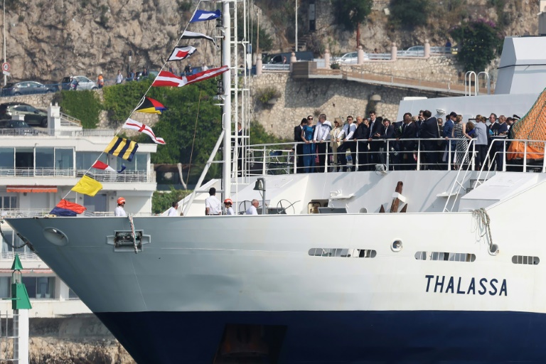 En début d'après-midi, plusieurs dizaines de navires scientifiques ou de prestige ont célébré la Journée mondiale des océans dans la baie des Anges, sous un vent fort et un ciel rendu laiteux par les fumées des incendies au Canada.