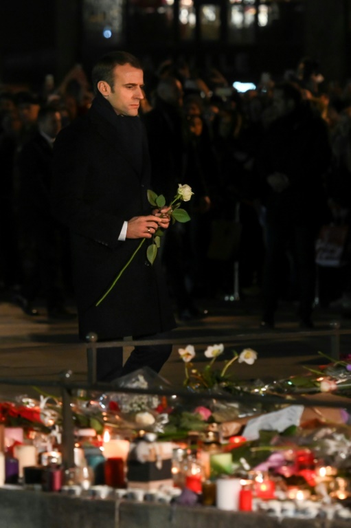 Emmanuel Macron s'est recueilli devant ce mémorial érigé sur le socle de la statue du général Kléber, alors que des détachements de militaires entonnaient une Marseillaise a capella, rejoints par la foule. Des centaines de bougies, fleurs et petits mots ont été déposés là depuis mercredi.