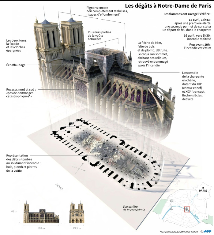 Les deux tours emblématiques de la façade ouest ont en revanche été épargnées, et le coq de la flèche a été retrouvé. La couronne d'épines et la tunique de Saint Louis, deux objets extrêmement importants pour les catholiques, ont pu être sauvées. "La piste accidentelle est toujours privilégiée", a précisé le parquet. Une trentaine d'ouvriers et d'employés chargés de la sécurité de l'édifice ont déjà été entendus.