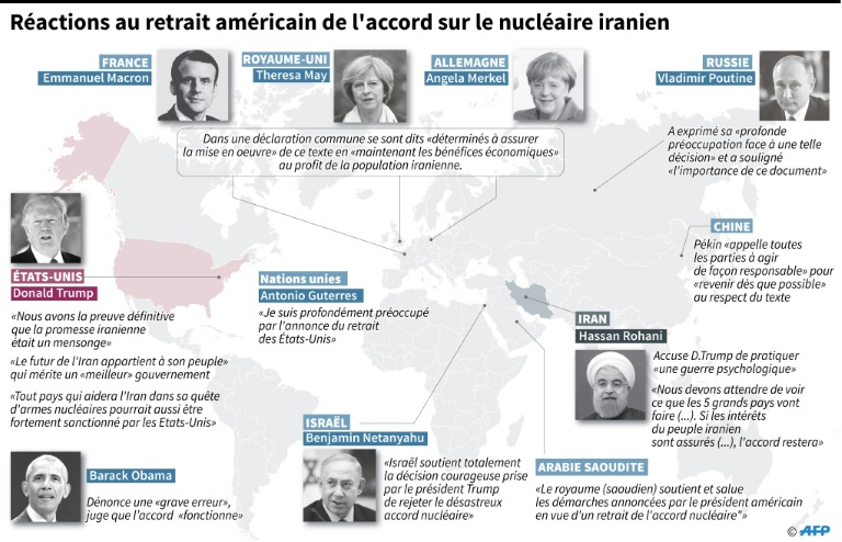 Après le retrait des États-Unis, la France, l'Allemagne et le Royaume-Uni, les trois pays européens signataires de l'accord de 2015, ont déjà décidé mardi soir de continuer à appliquer l'accord et "demandé à l'Iran de continuer à se conformer à ses obligations, en contrepartie l?Iran continuera à bénéficier de la levée des sanctions", a souligné l?Élisée.