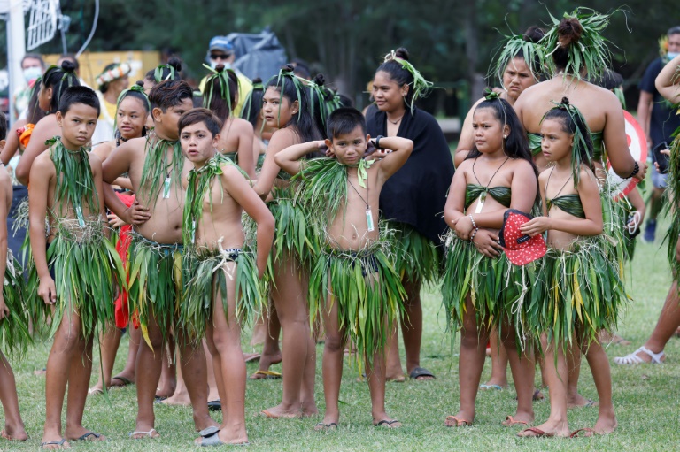 Pour cette occasion historique, les Marquisiens ont offert dimanche soir (lundi matin à Paris) un spectacle rare au chef de l'Etat avec une cérémonie traditionnelle de 600 danseurs et musiciens issus des six îles marquisiennes, vêtus de tenues végétales à base de auti, des feuilles effilées.