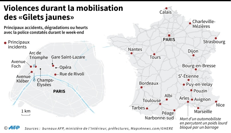 Dans Paris, les employés municipaux et les ouvriers tentaient dimanche de réparer les dégâts et nettoyer au lendemain de cette folle journée de violences inédites où certains gilets jaunes et des casseurs ont affronté la police dans les beaux quartiers, sous le regard médusé de Parisiens et de touristes, dans une ambiance insurrectionnelle, avec incendies, barricades, nuages de gaz lacrymogène, canon à eau, etc.