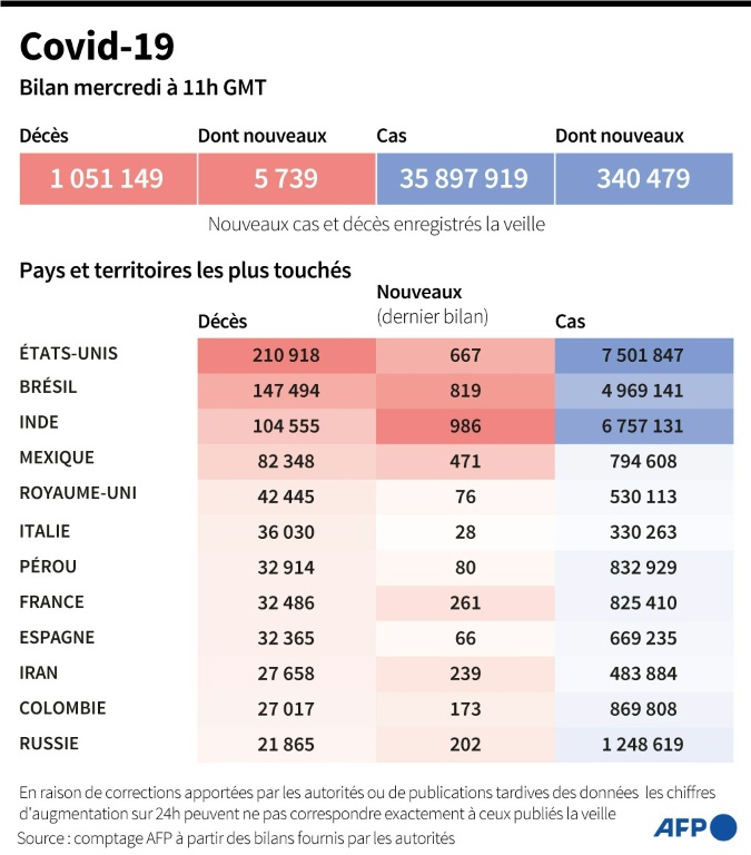 Dans le monde, la pandémie du nouveau coronavirus a fait au moins 1.051.149 morts depuis que le bureau de l'OMS en Chine a fait état de l'apparition de la maladie fin décembre, selon un bilan établi mercredi par l'AFP.