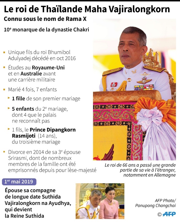 Maha Vajiralongkorn, monarque imprévisible à la personnalité déroutante, a été couronné samedi roi de Thaïlande, un symbole de stabilité dans un pays qui reste très divisé après les législatives de mars.