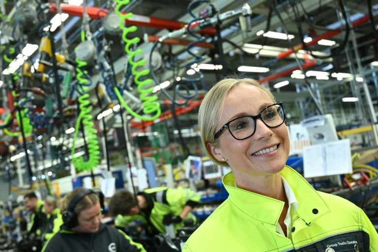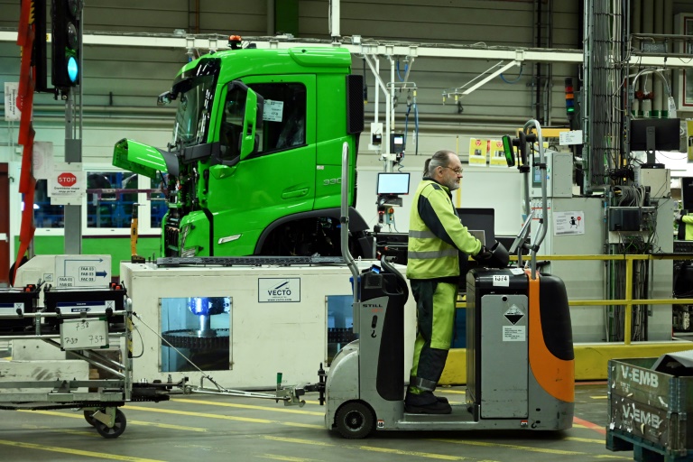 A l'aide d'un bras motorisé, un ouvrier de l'usine Volvo de Göteborg, en Suède, fait lentement avancer d'énormes blocs noirs le long d'un châssis: trois tonnes de batteries qui alimenteront bientôt un camion électrique, produit phare du numéro 2 mondial du secteur.