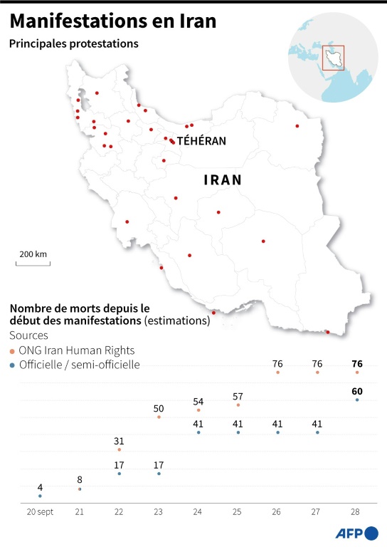 Selon l'agence de presse iranienne Fars, environ 60 personnes ont été tuées depuis le début des manifestations le 16 septembre, tandis que l'ONG Iran Human Rights, basée à Oslo, a fait état d'un bilan d'au moins 83 morts.