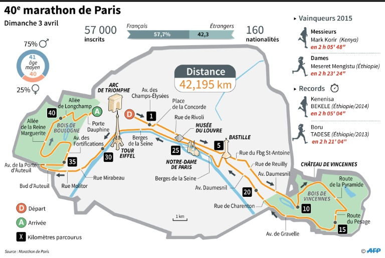 Dimanche, près de 50.000 participants (57.000 inscrits) sont attendus sur les 42,195 km d'un parcours qui traverse Paris d'est en ouest, entre Bois de Boulogne et Bois de Vincennes. De nombreux spectateurs et familles de participants, soit des dizaines d'autres milliers de spectateurs, sont également attendus le long des routes empruntées.