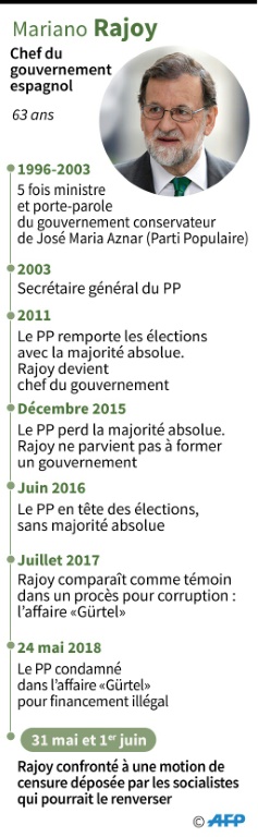 Une majorité des 350 députés ont voté vendredi une motion de censure présentée par le chef de l'opposition socialiste Pedro Sanchez à la suite de cette sentence, l'évinçant du pouvoir qu'il a conquis fin 2011. Sa patience l'avait pourtant jusqu'ici toujours sauvé, reconnaissent ses partisans, qui voient en lui un stratège hors pair, comme ses adversaires, qui le décrivent comme un immobiliste rigide et sans charisme