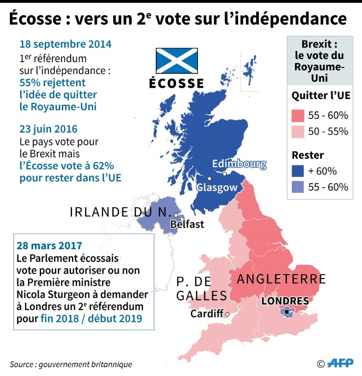 Nicola Sturgeon s'est aussi saisie de la décision de Mme May de quitter le marché unique pour revendiquer un nouveau référendum d'indépendance deux ans après celui de septembre 2014, alors que 62% des Ecossais ont voté pour rester dans l'UE. Selon elle, ce Brexit dur menace des dizaines de milliers d'emplois écossais.