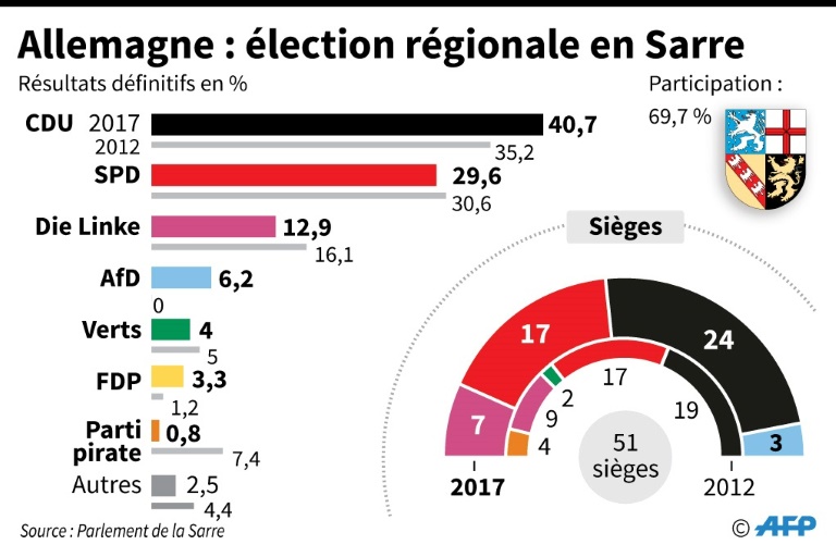 Le scrutin a fait toutefois l'effet d'une douche froide. Son parti, euphorisé par des sondages favorables, visait la victoire en Sarre où, à l'image de la coalition emmenée par Mme Merkel au niveau national, il gouverne en partenaire minoritaire avec la CDU. Mme Merkel doit elle aussi tenir une conférence de presse au siège de la CDU .