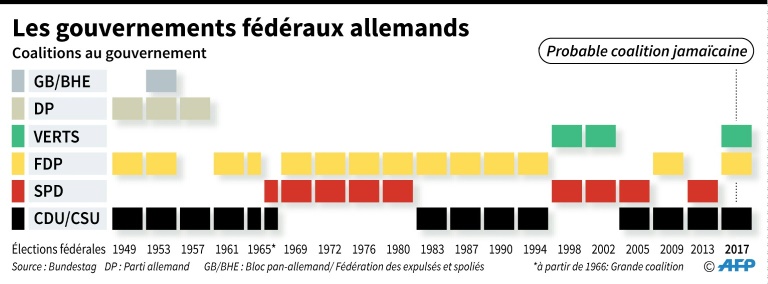Ces futurs pourparlers s'annoncent très compliqués : laminé et au plus bas depuis 1945, le SPD (20,5%) a annoncé vouloir se ressourcer dans l'opposition après quatre ans passés à gouverner avec Mme Merkel. Il ne reste sur le papier qu'une solution majoritaire: une alliance inédite au niveau national réunissant la CDU-CSU, les Libéraux du FDP, qui reviennent au Bundestag avec 10,7%, et les Verts, qui ont atteint 8,9%.