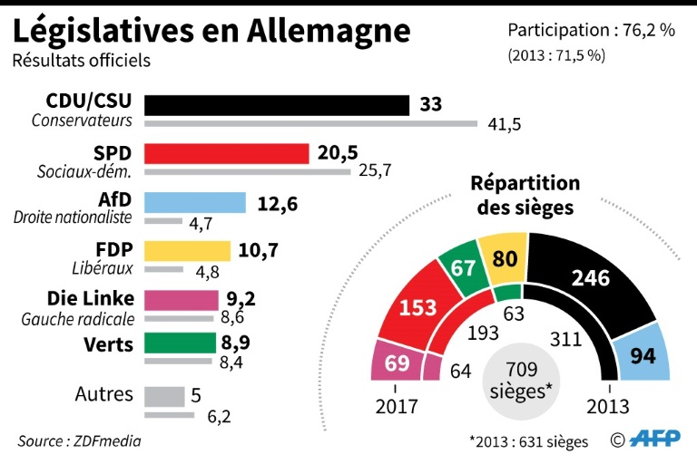 Victorieuse mais affaiblie par un score électoral décevant, Angela Merkel a promis de trouver une majorité stable de gouvernement et de récupérer les électeurs qui en masse ont choisi l'AfD, un parti dérivant vers l'extrême-droite.
