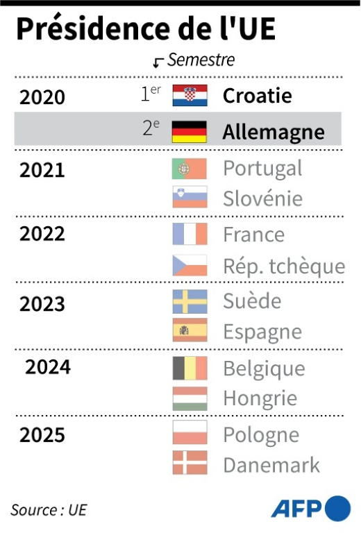 L'Allemagne a entamé mercredi sa présidence de l'UE face à des défis historiques, comme l'impact du coronavirus, avec l'espoir pour Angela Merkel de parachever son entrée au Panthéon européen.