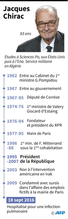 Depuis son départ de l'Elysée en mai 2007, M. Chirac, victime d'un accident vasculaire cérébral en septembre 2005, a été hospitalisé à plusieurs reprises, notamment une quinzaine de jours en décembre 2015, déjà à la Pitié-Salpêtrière, pour "affaiblissement". Il a par ailleurs été fortement éprouvé par la mort de sa fille aînée, Laurence, en avril. Ses proches faisaient cependant état ces dernières semaines d'une amélioration de son état.