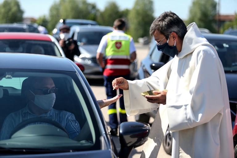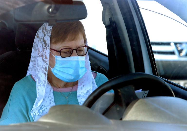 L'image est singulière: des dizaines de feux de détresse se mettent à clignoter sur le parking. Les prêtres s'avancent entre les rangées de voitures. Des vitres ouvertes se tendent des mains en coupe préalablement passées au gel hydroalcoolique.