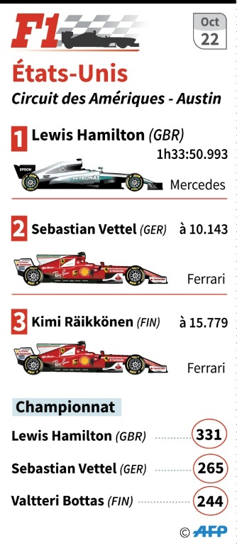 A neuf points d'un quatrième triomphe: après sa démonstration au GP des États-Unis, Lewis Hamilton pourra se contenter d'une cinquième place dimanche à Mexico pour être sacré champion du monde et rejoindre Alain Prost et Sebastian Vettel dans la légende.