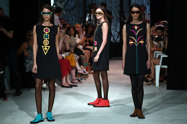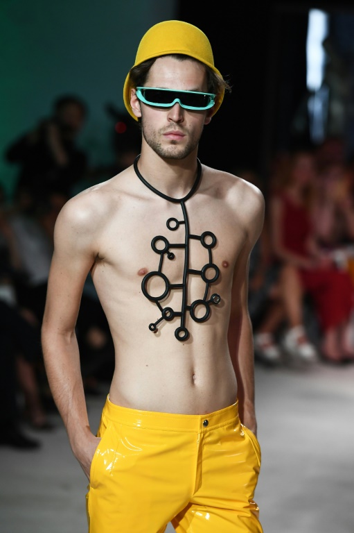 Le défilé s?est ouvert par des mannequins portant des lunettes de soleil futuristes, les hommes torse nu vêtus d?un pantalon noir ou coloré retenu par des bretelles et les femmes en jupe très courte.